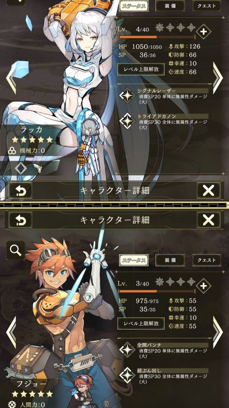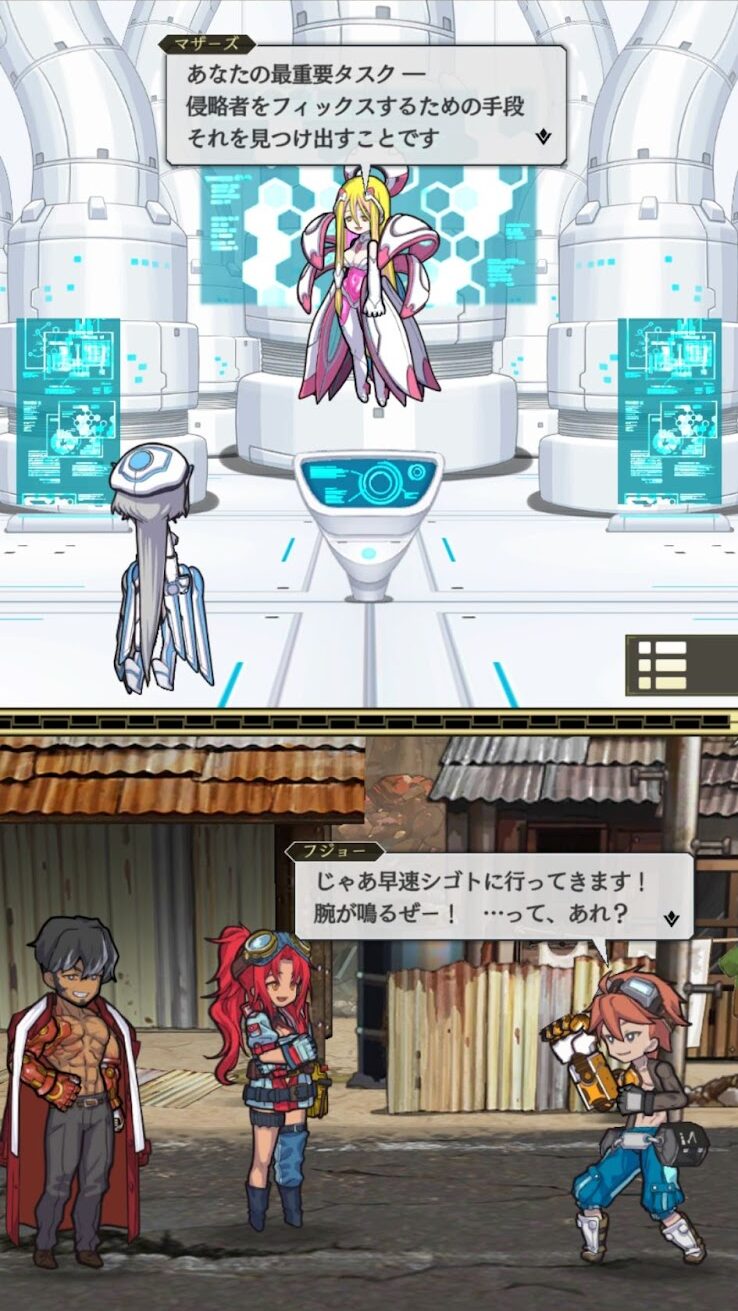 Hai nhân vật đầu tiên được giới thiệu với người chơi là Fujo và Lacca; một cậu bé Người nóng nảy với cánh tay giả và một Machina vô cảm đang được sửa chữa ở Thiên giới. Khoảng cách công nghệ giữa hai người là một dấu hiệu rõ ràng về sự phân chia giữa hai chủng tộc, điều này trở nên lộn xộn khi Lacca hoán đổi cánh tay của mình để lấy cánh tay giả của Fujo.