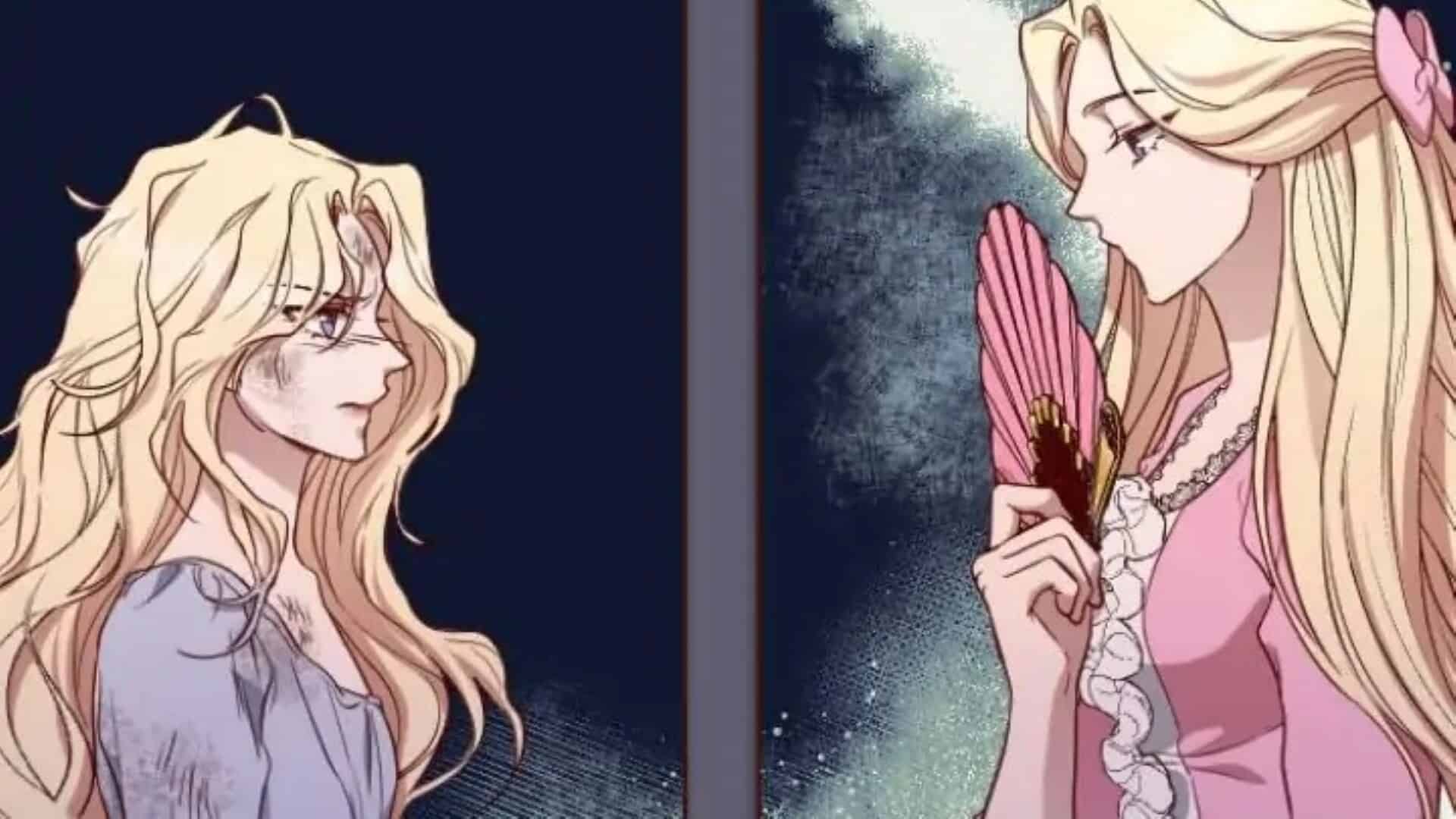 Ariane (à droite) affrontant Lyla (à gauche) aux portes du manoir de Valencia – Beast’s Flower Chapitre 1 (Crédits: Naver)