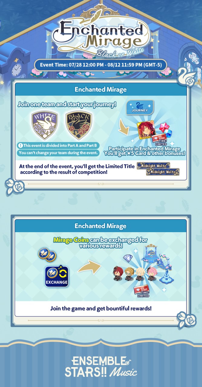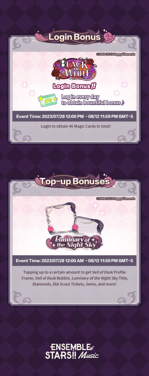 Tập hợp các ngôi sao!! Âm nhạc sẽ trở nên hoài cổ trong tháng này với sự ra mắt của sự kiện “Đen hoặc Trắng”! Lấy cảm hứng từ trò chơi cổ điển 2048, người chơi có thể tận hưởng lối chơi pha trộn đặc biệt trong trò chơi nhịp điệu. Chiến dịch gồm hai phần sẽ có phần thưởng, phần thưởng và nội dung độc quyền trong hai giai đoạn sự kiện. Phần A sẽ diễn ra từ ngày 28 tháng 7 đến ngày 12 tháng 8 năm 2023, với Phần B bắt đầu ngay sau đó.