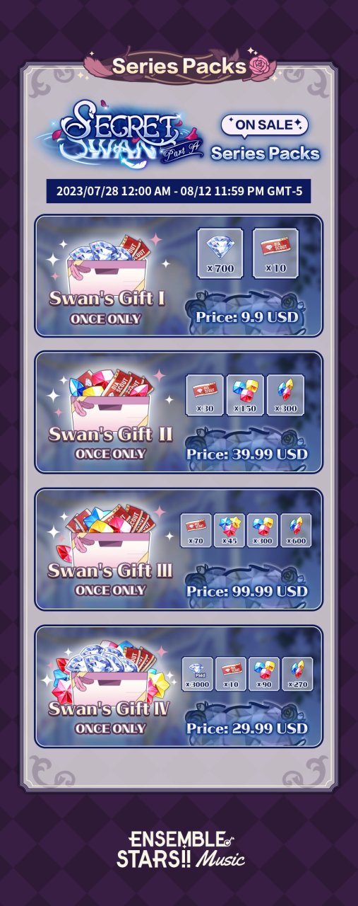 Ngoài ra, Gói sê-ri Secret Swan cũng được bán thông qua cửa hàng trong trò chơi! Mỗi gói chứa Dia đã trả tiền, Vé Hướng đạo và nhiều loại vật liệu nâng cấp để giúp bạn! Mỗi gói chỉ có thể được mua một lần cho mỗi tài khoản.