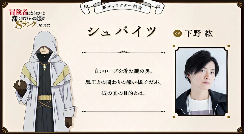 Tài khoản Twitter chính thức của anime truyền hình chuyển thể từ bộ light tiểu thuyết của MOJIKAKIYA “My Daughter Left the Nest and Returned an S-Rank Adventurer” (Bōkensha ni Naritai to Miyako ni Deteitta Musume ga S-rank ni Natteta) vừa tiết lộ một nhân vật mới.