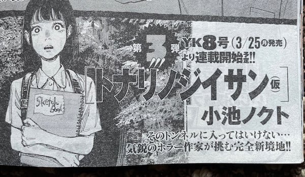 Số thứ ba năm nay của tạp chí Young King của Shonengahosha đã tiết lộ vào thứ Bảy rằng Nokuto Koike sẽ ra mắt một manga mới có tựa đề dự kiến là Tonari no Jiisan (My Old Man Neighbor) trong số thứ tám của tạp chí, sẽ phát hành vào ngày 25 tháng 3. Koike cũng đã công bố bộ truyện tranh mới trên tài khoản Twitter của họ và mô tả câu chuyện,”hơi giống một câu chuyện khoa học viễn tưởng kỳ lạ.”