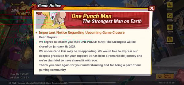 The One-Punch Man-Permainan telefon pintar Terkuat untuk iOS dan Android mengumumkan pada hari Sabtu permainan itu akan menamatkan perkhidmatan pada 19 Januari. Pembangun permainan itu, Shanghai Moonton Technology , dimiliki oleh ByteDance. Apl TikTok ByteDance tidak tersedia buat sementara waktu di A.S. pada hari Sabtu disebabkan keputusan Mahkamah Agung yang mewajibkan apl itu”dipisahkan daripada kawalan China.”Walaupun perkhidmatan dalam talian apl TikTok telah dipulihkan, One-Punch Man-The Strongest kekal di luar talian.