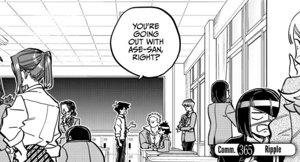 Tajuk bab minggu lepas Komi Can’t Berkomunikasi ialah”Riak.”Bab ini bermula dengan Tadano datang ke Kelas 3-4 untuk bertemu dengan Naruse-kun. Dia tahu bahawa dia akan pergi dating dengan Are-San. Tetapi apabila seluruh kelas mendengar ini, mereka semua kagum dengan berita itu. Semua lelaki tiba-tiba memandangnya dan mula mengusiknya kerana mempunyai teman wanita.