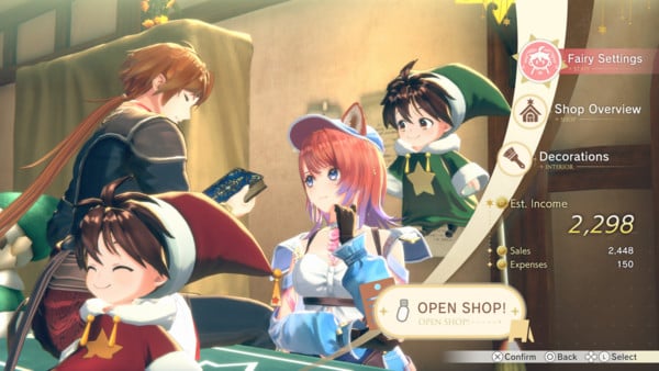 Het duurt een tijdje om het alchemiegedeelte van het spel te ontgrendelen (je moet het atelier zelf vinden), en tot die tijd moet je ook vertrouwen op de functie voor automatisch opslaan. Dat is grotendeels prima, maar net als bij alle automatische opslagen voelt het altijd alsof je op een enigszins ongemakkelijke plek wordt opgeslagen. Maar de gameplay zelf is gemakkelijk en leuk – alchemie, verbetering en winkelzaken zijn kleurgecodeerd om te zorgen voor wat voelt als een extra minigame terwijl je de zijkleuren combineert; Dat hoeft niet, maar uw artikelen zullen van betere kwaliteit zijn als u dat wel doet. Het maken van meer items zal ook resulteren in meer verzamelobjecten, omdat je specifieke gereedschappen nodig hebt om wat lekkers te oogsten. Er verstrijkt geen in-game tijd terwijl je aan het knutselen bent, dus je verliest daar niets. Elk item heeft een boom die het mogelijke evolutionaire pad laat zien, en als je deze volgt, ontgrendel je nieuwe craftables. Dit alles houdt verband met de winkel die Rias en Slade runnen, maar als je er geen zin in hebt, kun je dat aan de feeën overlaten.