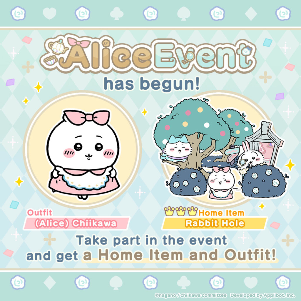 i Alice-arrangementet-arrangementet ALICE-arrangementet ALICE APPLATE APPLATES APPLATES APPLATES APPLATES APPLATE APPLATE APPLATES APPLYSE APPLATE APPLATE. I tillegg, ved å utjevne arrangementskortet, kan spillerne også skaffe Chiikawa i et Alice-antrekk, Rabbit Hole Home-varen og mer. Denne begivenheten inneholder også den nye kunstsamlingen og Challenge Battle Systems.