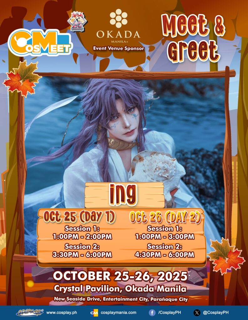 CosMeet 2025 skal finne sted 25. til 26. oktober på det prestisjetunge femstjerners hotellet Okada Manila i New Seaside Drive, Entertainment City, Parañaque City. Den to-dagers anime og cosplay høst-tastic-arrangementet vil ha gratis adgang for alle, og vil inneholde spennende spill og konkurranser, en storslått cosplay-parade, sceneopptredener og over 100 stander. I hovedrollen denne høstfestivalen er cosplayer Coser Ing fra Sør-Korea.