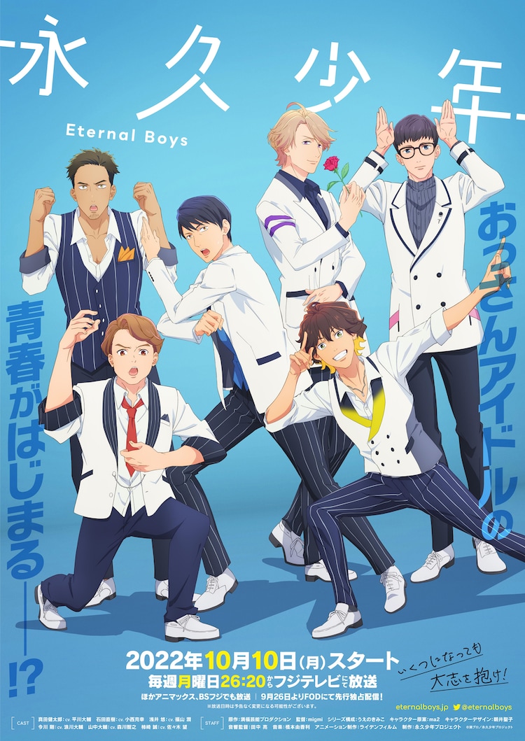 Den offisielle nettsiden og YouTube-kanalen til det originale anime-prosjektet Eternal Boys strømmet den første reklamevideoen, og avslørte ytterligere rollebesetning, hovedrollen visual, og premieredatoen 10. oktober. Animeen får premiere på Fuji TV 10. oktober, og sendes deretter på Animax og BS Fuji. Animen vil strømme tidlig på FOD-tjenesten 26. september.