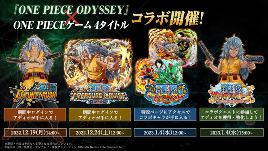 One Piece Odyssey vil også samarbeide med de fire One Piece-mobiltitlene fra desember til januar, mens originalen karakterer fra One Piece Odyssey kommer til spillene; One Piece Bounty Rush, One Piece Treasure Cruise, One Piece Grand Collection og One Piece: Thousand Storm som spillbare karakterer.