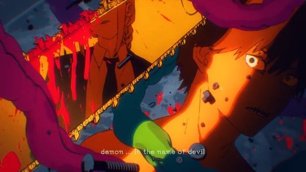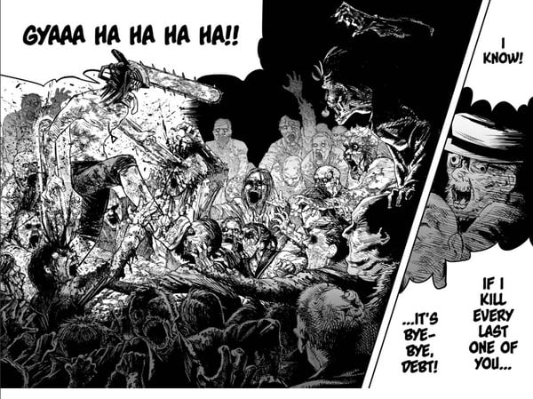 ถึงอย่างนั้น ฉันเกลียดอนิเมะ Chainsaw Man! และฉันก็เกลียดมันมาตั้งแต่ตอนแรก ซึ่งมันล้มเลิกการพยายามถ่ายทอดภาพและธีมของ Denji ที่แปลงร่างเป็น Chainsaw Man เป็นครั้งแรก ในมังงะ ฉากนี้แสดงให้เห็นว่าเดนจิลุกขึ้นเหนือกองกำลังที่กดขี่เขาด้วยพลังแห่งความรุนแรงอันน่าเหลือเชื่อ ทำให้เขาสามารถหลบหนีความมืดมิดที่เขาอาศัยอยู่ได้ งานศิลปะและแผงผนังของฟูจิโมโตะถ่ายทอดความรู้สึกนี้ได้อย่างสมบูรณ์แบบ โดยที่เดนจิมีร่างกายเหนือกว่าผู้ที่ทำร้ายเขา และเขาเป็นจุดขาวเพียงจุดเดียวในพื้นหลังสีดำ อนิเมะจะปรับช่วงเวลานี้ให้กลายเป็นการต่อสู้ที่น่าเบื่อหน่ายหากนองเลือด