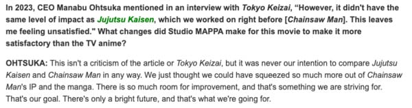 ฉันรู้สึกประทับใจน้อยกว่าจากคำกล่าวนี้ของประธาน MAPPA Manabu Ohtsuka ในการสัมภาษณ์ ANN เมื่อเร็วๆ นี้ โดยปกติแล้ว ฉันจะเป็นคนแรกที่ยอมรับว่าอนิเมะเป็นผลิตภัณฑ์ที่สร้างขึ้นโดยมีจุดประสงค์เพื่อสร้างรายได้ นั่นเป็นเพียงความจริงที่เย็นชาและยากลำบาก แต่เมื่อสตูดิโอแห่งหนึ่งเต็มไปด้วยข้อกล่าวหาเรื่องอื้อฉาวด้านแรงงาน และผู้นำของสตูดิโอกำลังพูดถึงการบีบ”มากกว่านั้น”ออกจาก IP ก็ทำให้คนเลิกคิ้วขึ้นเป็นธรรมดา และตอนนี้เรากำลังเข้าสู่ความขัดแย้งที่เป็นแก่นของโปรเจ็กต์ Chainsaw Man ใดๆ ที่ผลิตโดย MAPPA ในขณะที่ Chainsaw Man กล่าวถึงประเด็นต่างๆ มากมาย โดยแก่นของมังงะคือเนื้อหาเกี่ยวกับการที่ระบบทุนนิยมและสังคมทุนนิยมแสวงหาประโยชน์จากผู้คนในตำแหน่งที่อ่อนแอ และทำให้พวกเขาแปลกแยกจนถึงจุดที่พวกเขาแทบจะไม่สามารถเชื่อมต่อกับผู้อื่นในสังคมได้ MAPPA อาจเปิดเผยมากกว่าสตูดิโออื่นๆ โดยพยายามใช้ IP ยอดนิยมเพื่อเพิ่มรายได้สูงสุด