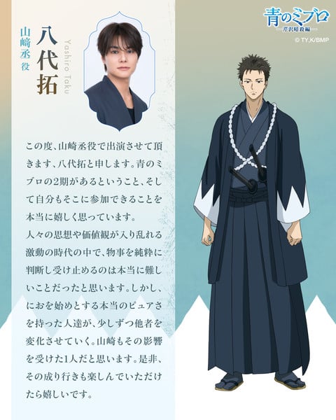 ทีมงานของทีวีอนิเมะ ของมังงะ Blue Miburo (Ao no Miburo) ของ Tsuyoshi Yasuda (Ao no Miburo) เปิดเผยรายชื่อนักพากย์ใหม่สำหรับซีซั่นที่สองของอนิเมะเมื่อวันอาทิตย์ที่ผ่านมา Taku Yashiro จะร่วมแสดงโดยเป็น Yamazaki Susumu ชายที่แทนที่จะมายุ่งกับธุรกิจของครอบครัว แต่กลับเดินไปรอบๆ เพื่อพยายามหาเลี้ยงชีพด้วยดาบของเขา (ชื่อในอดีตจะแสดงนามสกุลเป็นอันดับแรกที่นี่)