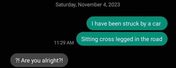 ในขณะที่ฉันออกไปทำธุระในเช้าวันหนึ่งที่อากาศหนาวเย็นในปี 2023 ฉันพบว่าตัวเองถูกรถขับไปบนถนน ฉันไม่เคยหมดสติ แต่ฉันก็พบว่าตัวเองถูกมัดไว้กับเกอร์นีย์ในร่างที่ไม่ใช่ของฉันอีกต่อไป ตอนนี้ฉันต้องสำรวจโลกที่มือของฉันเอง ซึ่งใช้แค่การเคาะคีย์บอร์ดหรือแตะปุ่มบนตัวควบคุมเท่านั้น ตอนนี้ไม่สามารถคว้าหรือยกตุ๊กตาจระเข้หนัก 3 ปอนด์ได้ เนื่องจากยาแก้ปวดได้รับการดูแลอย่างเข้มงวดจากโรงพยาบาล ฉันจึงต้องคุ้นเคยกับความเจ็บปวดของกระดูกต้นแขนหักและข้อศอกที่หัก