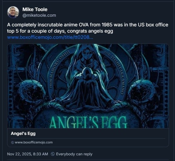 ใช่ ดังที่เราได้กล่าวพาดพิงถึงเมื่อสัปดาห์ที่แล้ว พวกเราที่ TWIA ต่างตื่นเต้นเกินกว่าที่จะได้ชมภาพยนตร์ของ Mamoru Oshii ในโรงภาพยนตร์ระดับ 4K Angel’s Egg…และปรากฎว่าไม่ใช่เราคนเดียว! ไทม์ไลน์และเซิร์ฟเวอร์ Discord เป็นเหมือนกล่องการสนทนาเรื่อง Egg อย่างแท้จริง ซึ่งถือว่ายอดเยี่ยมมากสำหรับตำนานเก่าแก่ที่แปลกประหลาดเช่นนี้