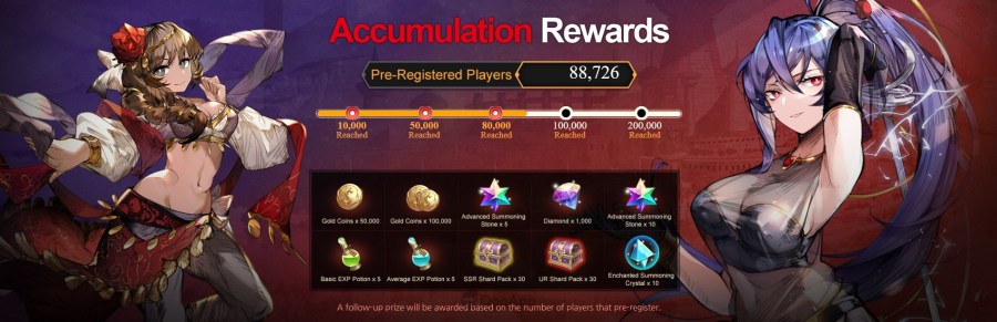 คุณสามารถลงทะเบียนล่วงหน้าสำหรับเกมตอนนี้เพื่อรับรางวัลมากมาย! ผู้เล่นที่ลงทะเบียนจะได้รับ 50,000 เหรียญทองและ 500 เพชร และแคมเปญการลงทะเบียนล่วงหน้าพร้อมให้ใช้งานแล้วในขณะนี้ ซึ่งผู้เล่นทุกคนจะได้รับรางวัลมากมายเมื่อเริ่มเกม หากเกมมีการลงทะเบียนล่วงหน้าถึง 200,000 ครั้ง!