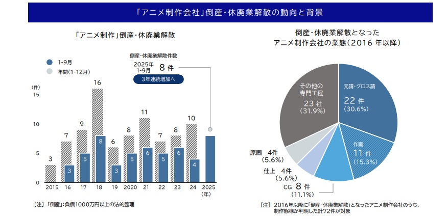 ตามรายงาน สตูดิโออนิเมะ 8 แห่งหยุดดำเนินการระหว่างเดือนมกราคมถึงกันยายน 2025 โดยมีการยื่นฟ้องล้มละลาย 2 แห่งและปิดตัวลง 6 แห่ง นับเป็นปีที่สามติดต่อกันที่จำนวนสตูดิโอออกจากตลาดในช่วงเวลานี้เพิ่มขึ้น