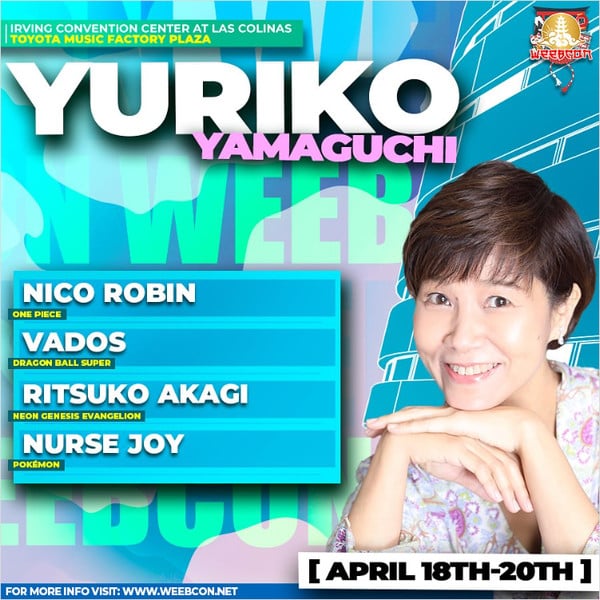 WeeBcon ประกาศเมื่อวันเสาร์ว่านักแสดงเสียง Yuriko Yamaguchi จะเข้าร่วมการแข่งขันในฐานะแขก การประชุมจะจัดขึ้นที่ศูนย์การประชุมเออร์วิงลาสโคลินาสในเออร์วิง, เท็กซัสตั้งแต่วันที่ 18-20 เมษายน